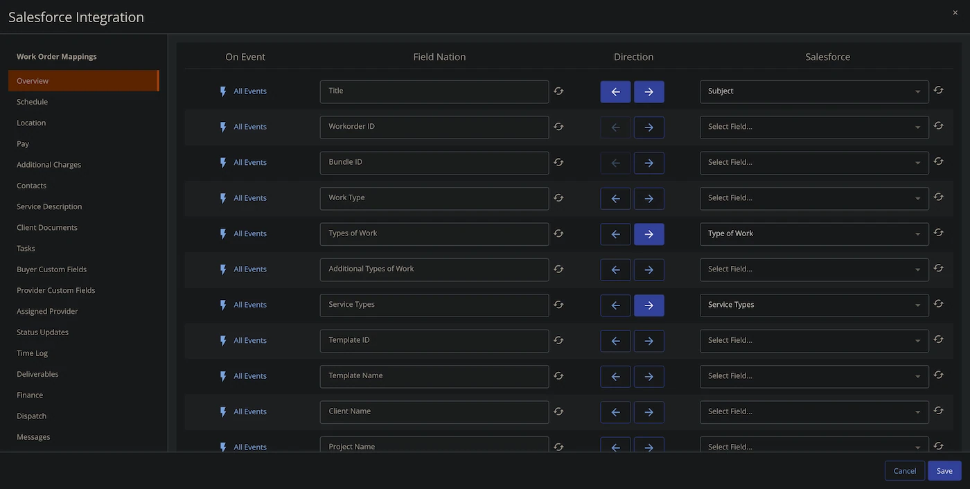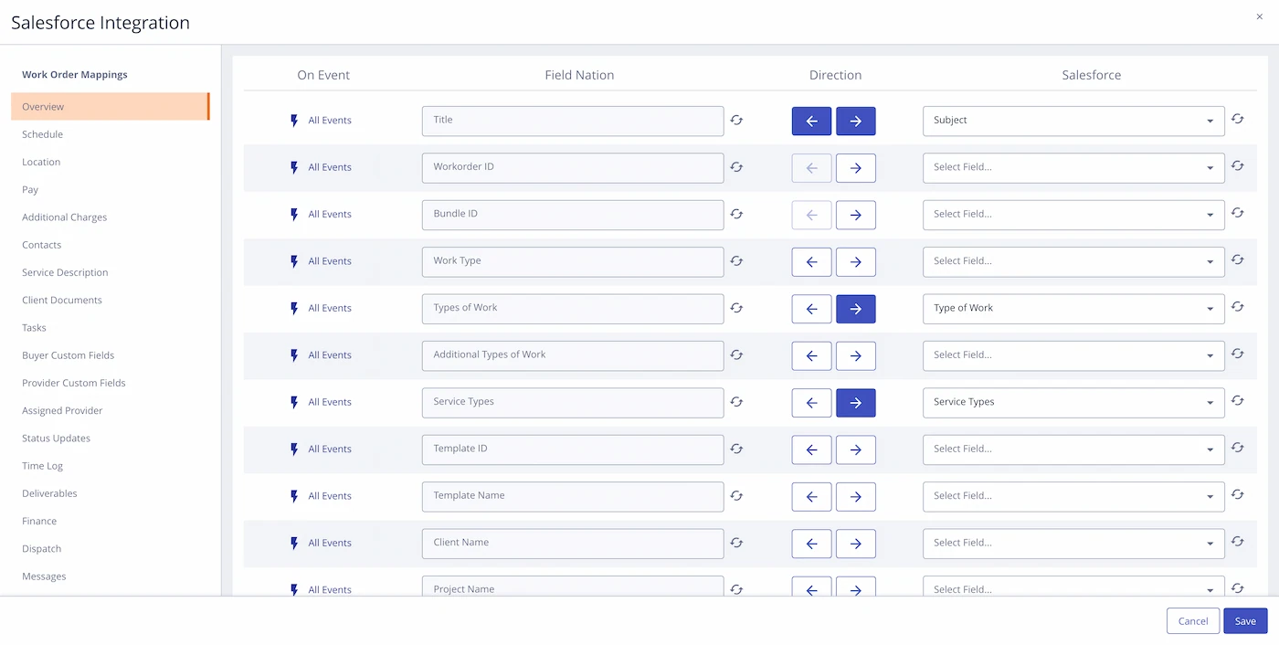Map Field Nation work order fields to your system's fields through the visual mapper. Set up inbound and outbound sync directions.